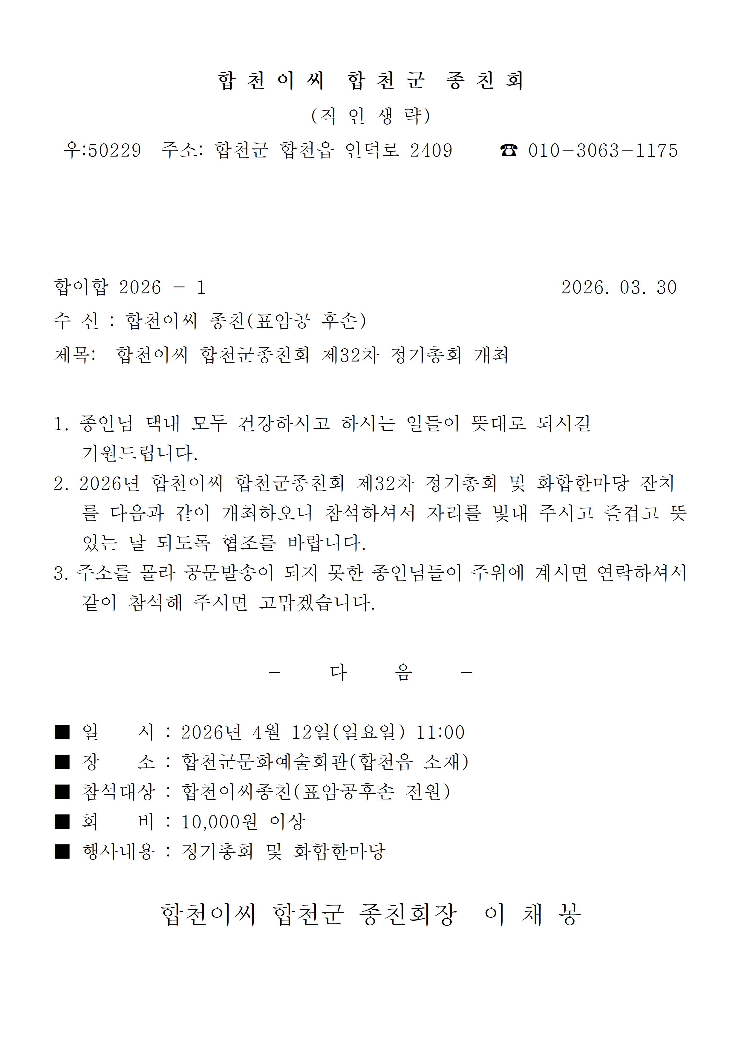 2026년 합천군종친회 정기총회 안내