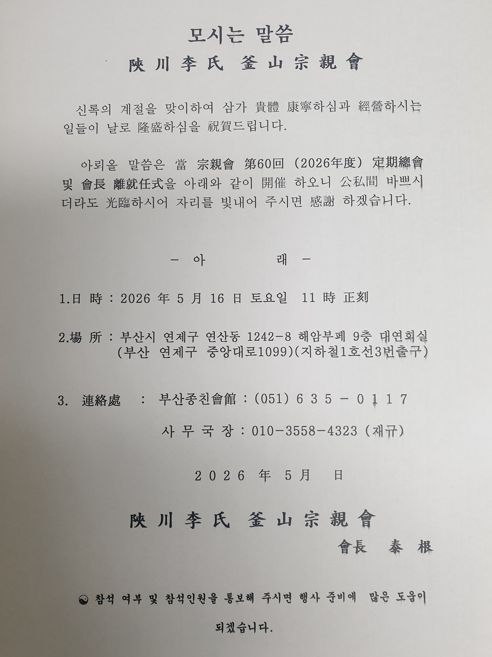 2026년 부산종친회 정기총회 안내