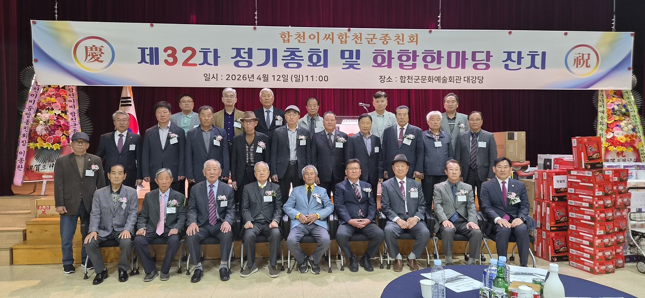 2026년 4월 12일(일) 오전 11시, 합천군 종친회 제32차 정기총회가 합천문화예술회관 대강당에서 개최되었습니다.